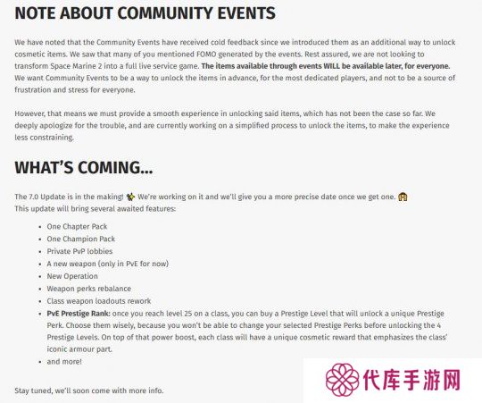 联合声明中提到:“我们看到你们中的许多人提到了活动产生的FOMO(Fear of Missing Out,指一些玩家担心错过限时提供的装饰物品)。请放心,我们并不想将《战锤40K:星际战士2》变成一款完整的实时服务游戏,通过活动获得的物品将在之后提供给所有玩家。”