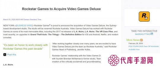 Take-Two也在官方声明中表示:“多年来与Video Games Deluxe密切合作,我们很高兴他们能加入我们的澳大利亚团队。”