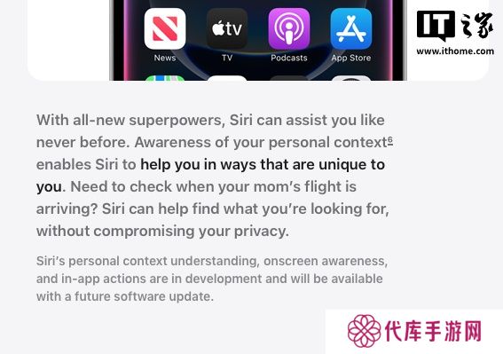 本站 3 月 12 日消息,苹果公司备受期待的 Apple Intelligence 中针对 Siri 的新功能已被无限期推迟,这些新功能原被认为是 iPhone 16 系列的一大亮点,但苹果在上周末已悄然撤下了一则展示 Siri“个人上下文”功能的 YouTube 广告。如今,苹果在其官网的 iPhone 营销页面上新增了一则免责声明,针对尚未发布的 Siri 功能进行了说明。