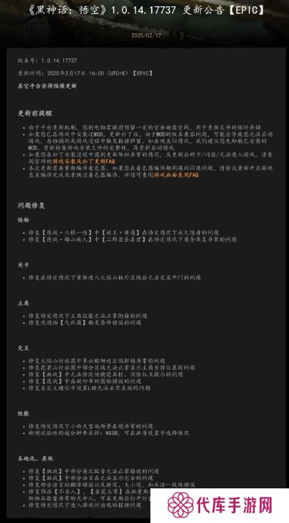 《黑神话:悟空》发布了1.0.14.17737版本更新公告,目前该版本已经上线Epic平台,Steam、PS5等其他平台将陆续更新。本次更新主要以修复问题为主,并新增了试验性的超分辨率采样:NXSR,可在画质设置中选择使用。