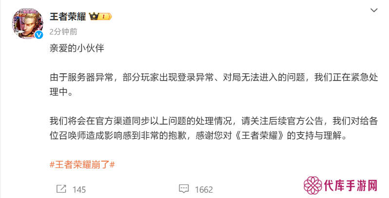 【21:40 更新】王者荣耀官微发文回应:由于服务器异常,部分玩家出现登录异常、对局无法进入的问题,我们正在紧急处理中。我们将会在官方渠道同步以上问题的处理情况,请关注后续官方公告,我们对给各位召唤师造成影响感到非常的抱歉,感谢您对《王者荣耀》的支持与理解。