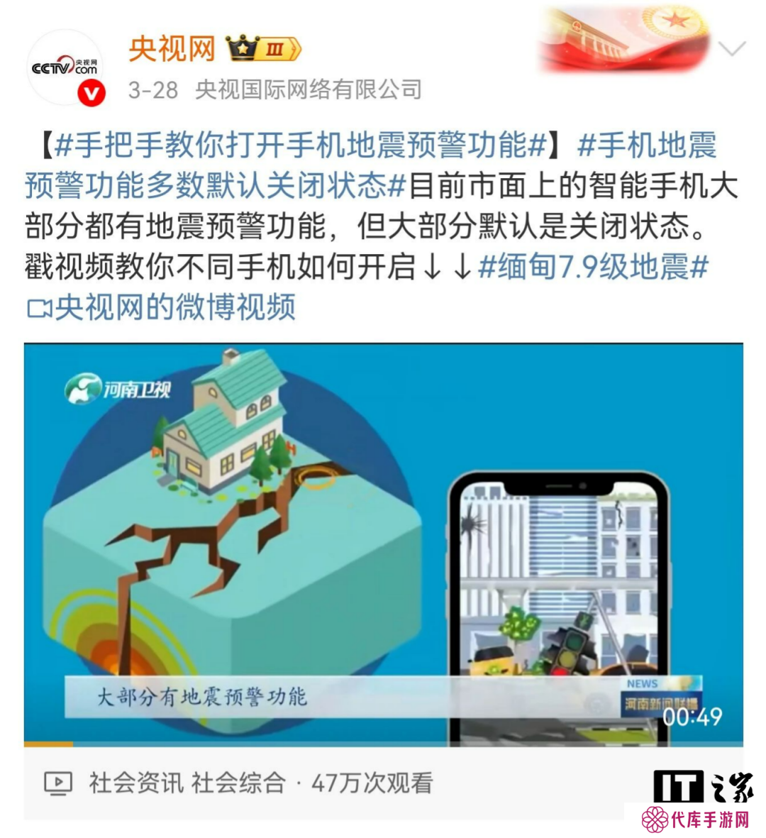 对此在昨天(3 月 29 日),网友们针对“预警”在社交媒体上展开了讨论,央视网援引河南卫视视频表示目前市面上的大部分智能手机都内置地震预警功能,但有的是默认关闭状态。