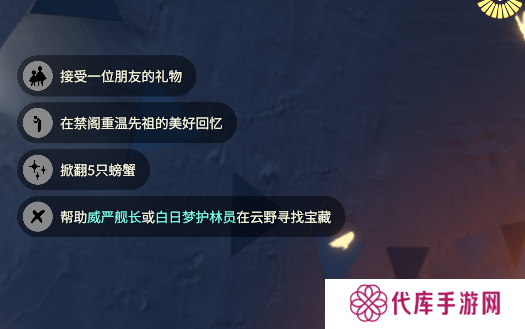 以上就是关于光遇3.24每日任务怎么做的全部内容了,今天的季节每日任务主要都刷新在禁阁,大家快和小伙伴们一起去完成任务吧~