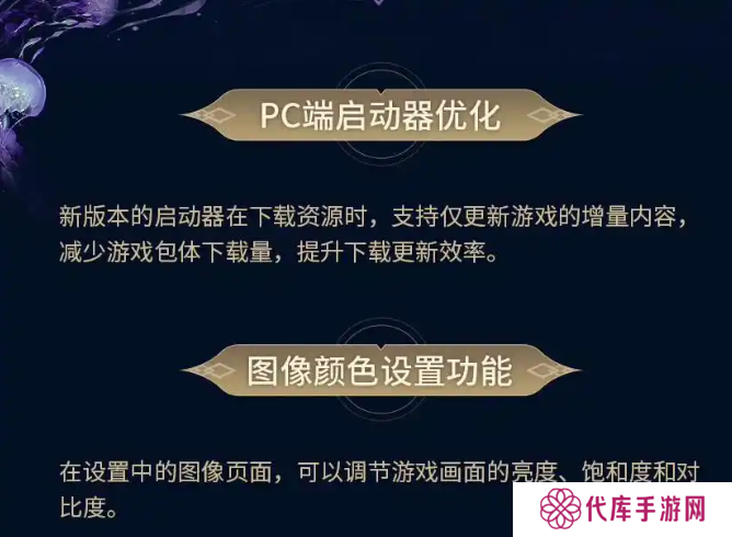 系统优化,包括PC启动器优化、图像颜色设置功能、强化界面快捷开启物资箱子、剧情文本回顾功能、称号系统、探索优化,
